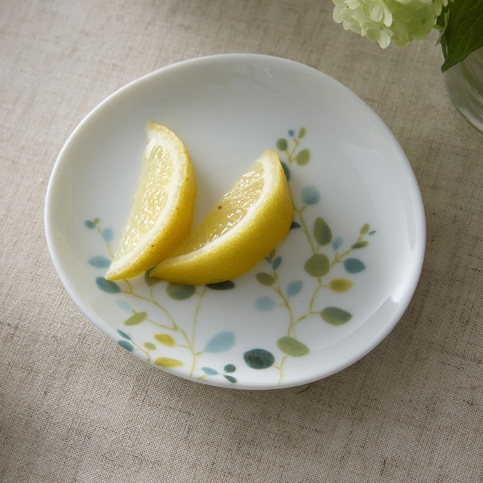 やわらかな弧を描くシンプルなフォルムの11cmプレート。quietタイプには、華やかな色合いのユーカリがメインで描かれています。自然の吐息を感じるほがらかなsotlightのイラストレーションと、丁寧につくりあげた深山の白磁が調和し、生まれた食の器。日々の暮らしのなかで食卓を明るく彩ります。
